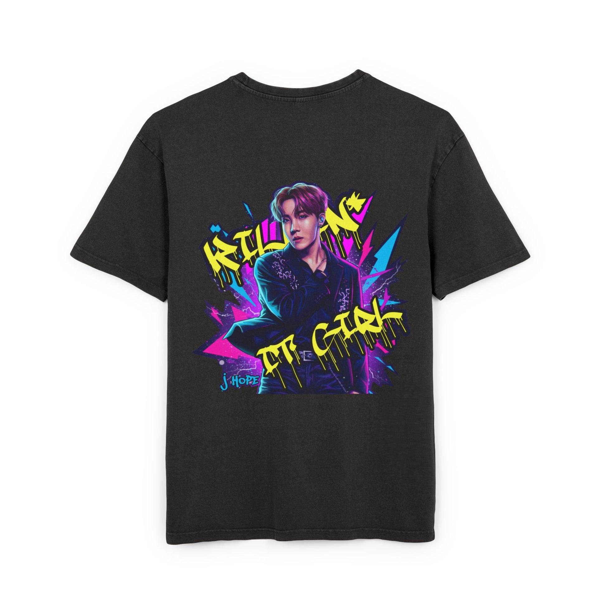 This black, short-sleeved acid washed oversized t-shirt features an electrifying graphic on the back that pops with color and attitude. At its heart is an illustration of J-hope framed by an explosion of vibrant neon graffiti-style elements in hot pink, electric blue, and bright yellow, creating a sense of dynamic energy. Large, fragmented text that reads "KILLIN* IT GIRL" is integrated into the design, adding a bold, confident statement. Below the main image, the name "J-HOPE" is also visible. The design combines a modern artistic style with an urban, street-art sensibility, making it a standout piece.