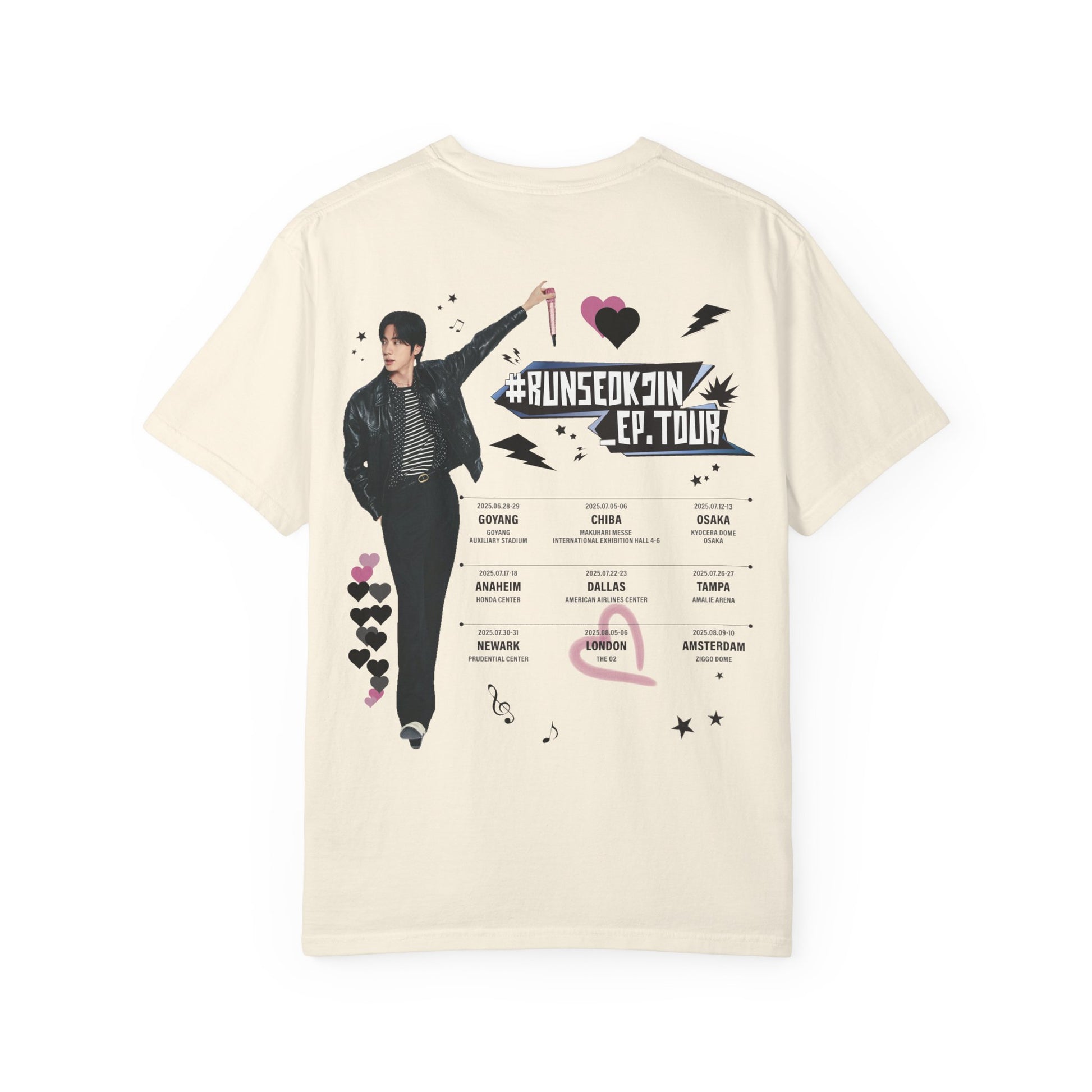 Show your love for Runseokjin with this exclusive EP. TOUR graphic t-shirt. Made from comfortable, soft fabric in a versatile cream shade, the back of the shirt proudly displays a stylish illustration of Runseokjin along with all the confirmed dates and locations for his 2025 tour, including: